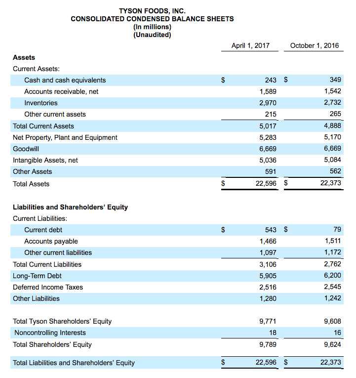 Springdale, Arkansas – May 8, 2017 – Tyson Foods, Inc. (NYSE: TSN), one of the world's largest food companies with leading brands including Tyson®, Jimmy Dean®, Hillshire Farm®, Sara Lee®, Ball Park®, Wright®, Aidells® and State Fair®, today reported the following results: